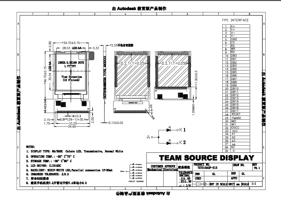 1.44寸TFT液晶屏◆分辨率128*RGB*128;◆外形尺寸30.9*36.51*2.3mm ;◆视窗尺寸25.5*26.5mm;◆MUC8bit 单片机使用;◆可自带按键或触摸屏功能;◆可根据客户要求定制特殊功能