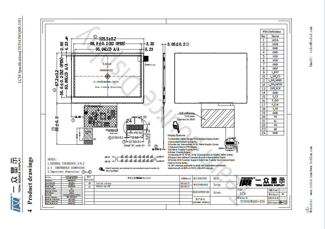 4.3寸LCD 480*272 IPS 1000亮度 SPI接口 TFT LT7680 IC 医疗 车载产品用液晶显示屏