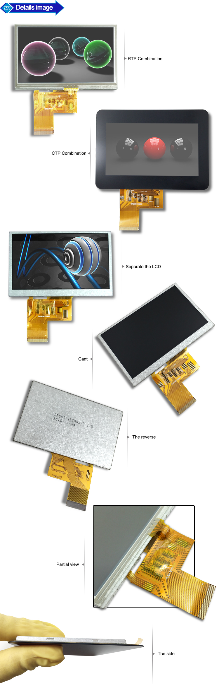4.3寸480*272分辨率TFT 有350/500/1000 三种亮度 带标准电阻喝电容触摸,40PIN RGB接口 BOE和CMI 玻璃可选 产品高亮度可支持户外可见 新增AR 抗反射工艺 AG 防眩晕功能 和AF防指纹 多运用于高端智能家居 智能手持终端